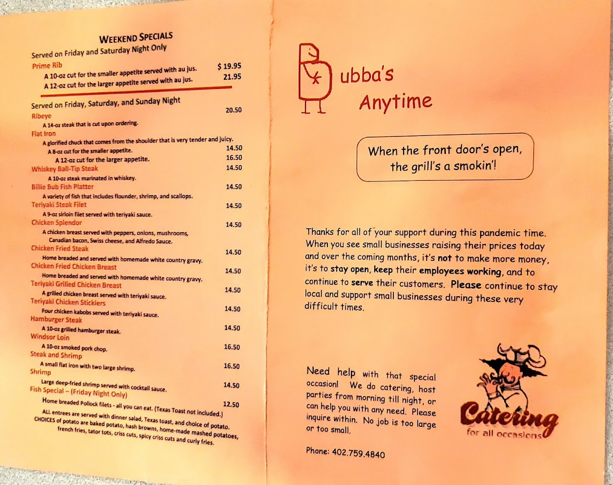Bubba’s Anytime Menu